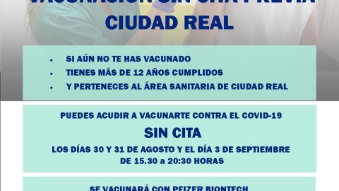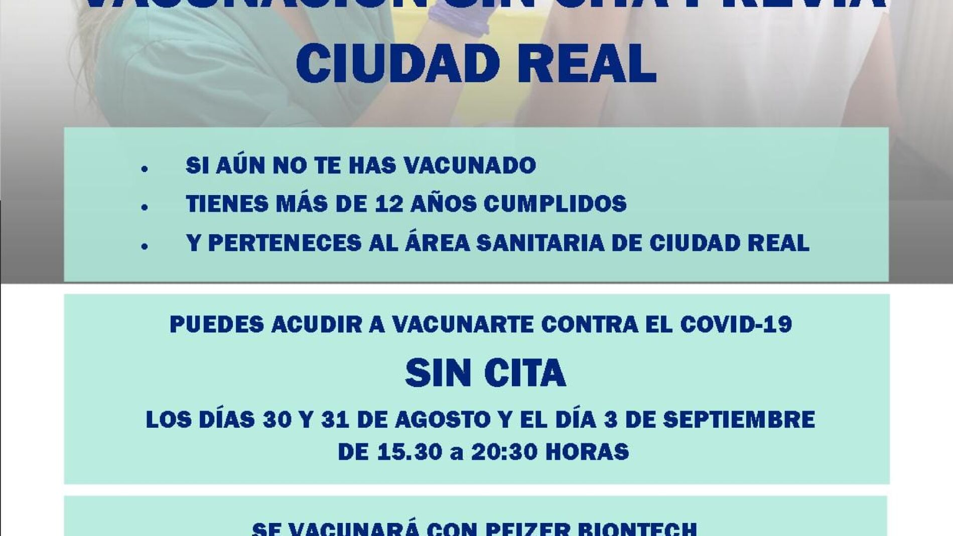 Una vacunación masiva sin cita previa para aquellas personas que aún no se han vacunado contra el coronavirus, tienen más de 12 años cumplidos y pertenecen al área sanitaria de Ciudad Real.