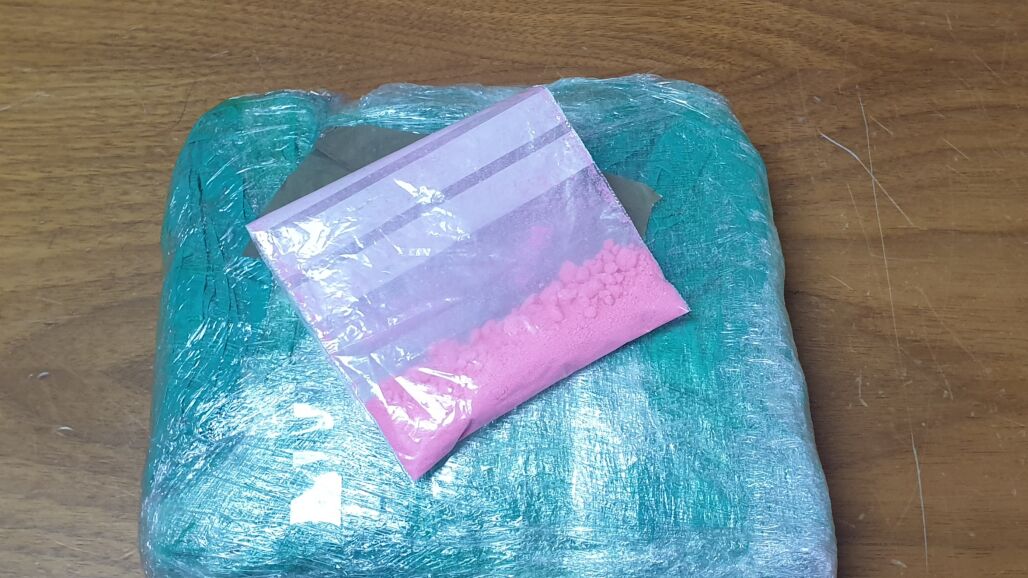 El resultado fue la incautación de 860 gramos de "cocaína rosa", compuesta de anfetamina, metanfetamina y éxtasis, envueltos en una bolsa transparente en el interior de un paquete de color marrón, ocultos en uno de los habitáculos del turismo.