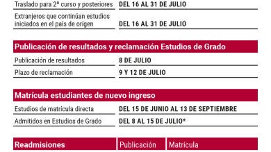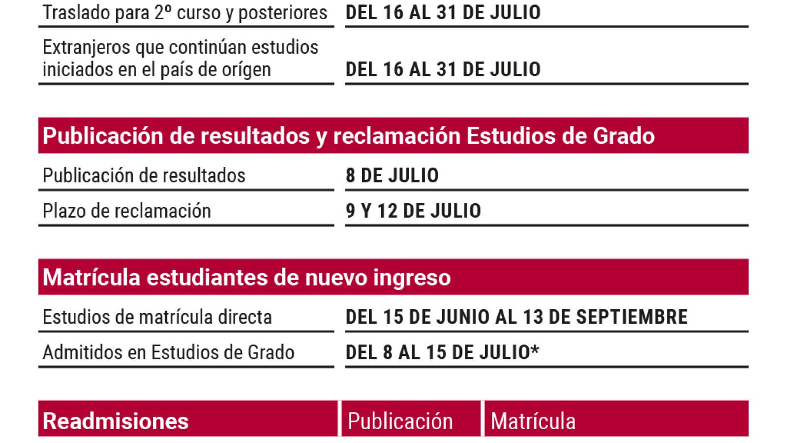 El período de matrícula para los estudiantes que vayan a empezar primero de grado el próximo curso se extenderá entre el 8 y el 15 de julio en primera instancia, pero se abrirán nuevos plazos en julio y septiembre para que puedan matricularse también los estudiantes que accedan a las plazas de las tres readmisiones posteriores a la del 8 de julio.