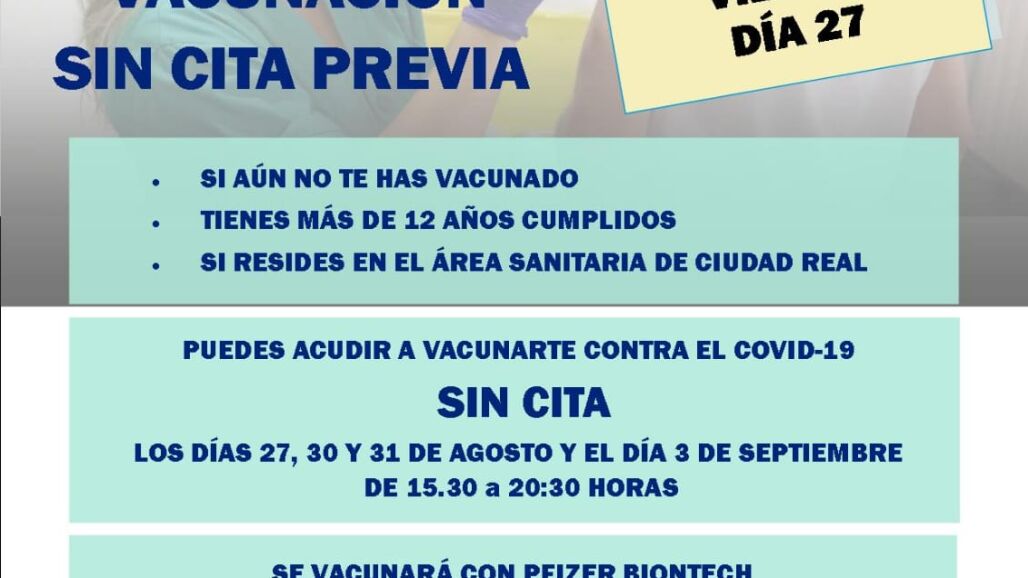 Esta vacunación sin cita previa va dirigida a aquellas personas que residan en el área sanitaria de Ciudad Real, aún no han sido vacunados y tienen más de 12 años cumplidos