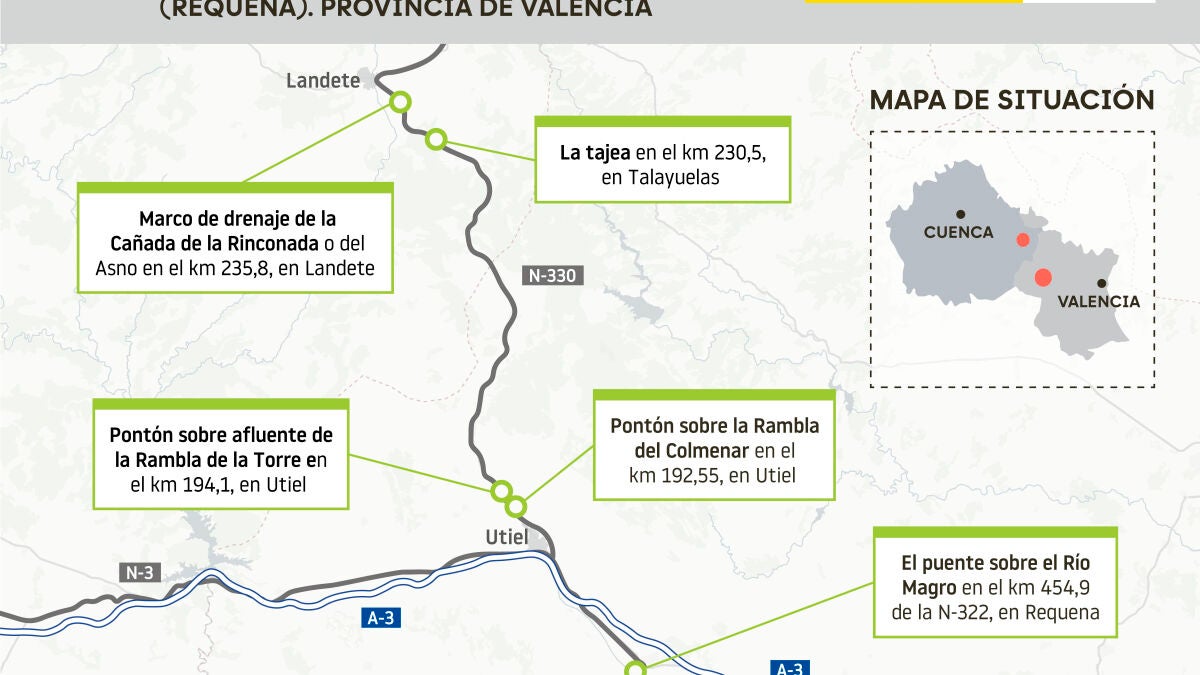 En la N-330, los trabajos han incluido la reparación del pontón sobre la Rambla del Colmenar y la construcción de un nuevo puente sobre un afluente de la Rambla de la Torre, ambos en Utiel. También se ha levantado una nueva estructura de drenaje en la Cañada de la Rinconada, en Landete, y se ha actuado en una tajea en Talayuelas.