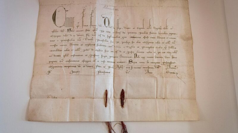 La Bula, enriquecida con el sello de plomo con los Santos Pedro y Pablo, contiene la confirmación del Papa Clemente VI al Deán y al Cabildo de Sigüenza.