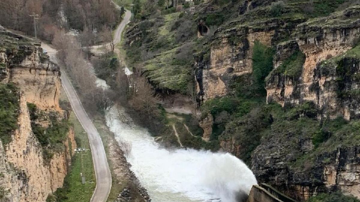 El embalse de Alcorlo desembalsa agua desde ayer a través de los desagües de medio fondo de la presa. Sin embargo, el Henares también recibe el caudal que llega desde el embalse de Beleña y desde el embalse de Pálmaces.