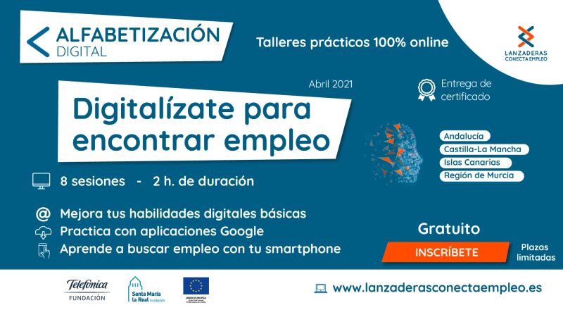 La nueva edición de ‘Alfabetización Digital’ se llevará a cabo entre los días 14 y 29 de abril, ambos inclusive. Esta actividad, con plazas limitadas, se dirige a personas en desempleo de entre 18 y 60 años de Andalucía, Castilla-La Mancha, Islas Canarias y Región de Murcia.