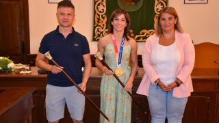 El broche a esta recepción lo ha puesto Sandra, junto a Jesús, firmando una dedicatoria a la ciudad en una bandera blanquiazul, así como, posteriormente, han recibido un bastón cerámico en señal del orgullo y la admiración de toda la ciudadanía.