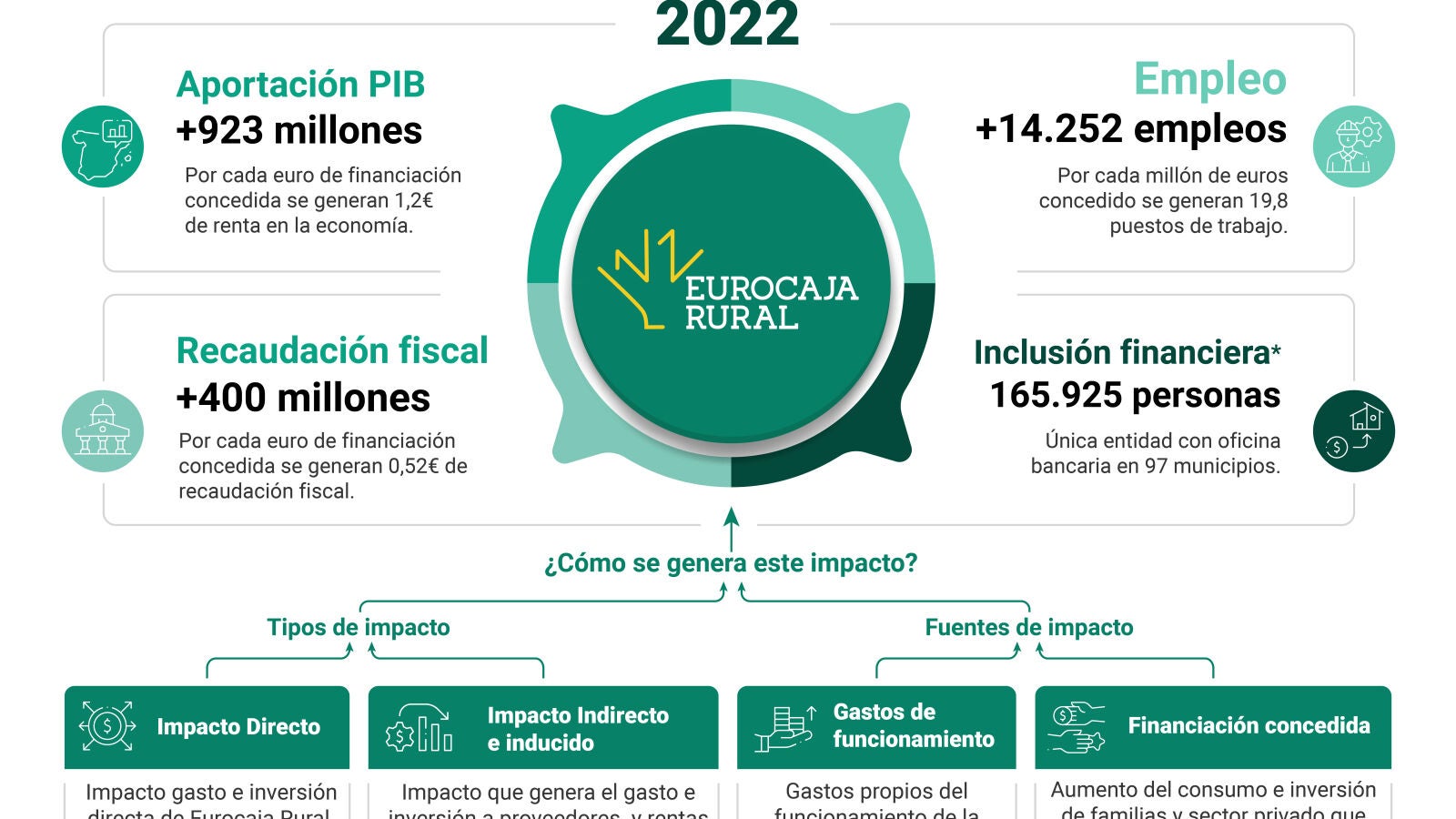 Eurocaja Rural contribuyó al PIB nacional con 923 millones en 2022. Esta contribución viene generada tanto por impacto directo del gasto e inversión de Eurocaja Rural, como de manera indirecta e inducida por el gasto e inversión a proveedores y rentas generadas de esas compras, así como por la financiación concedida. Esta financiación genera un aumento del consumo e inversión de familias y sector privado que a su vez genera un incremento de producción en la economía. Esta actúa como palanca dinamizadora que hace que por cada euro de financiación concedida se generen 1,2 euros de renta en la economía española.