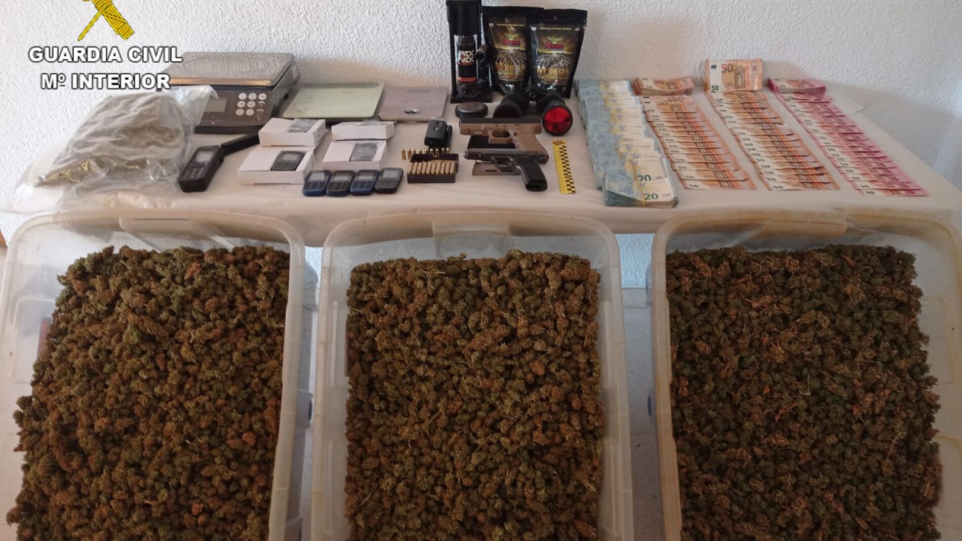 El pasado 21 de octubre, los agentes realizaron, con la correspondiente autorización judicial, una entrada y registro en la vivienda, donde se desmanteló este punto de elaboración, cultivo y tráfico de drogas, logrando intervenir hasta 165,4 kilos de cogollos de marihuana en proceso de secado, 244 plantas de marihuana de gran tamaño, 34.000 euros en efectivo en billetes de diverso valor, un turismo de alta gama, un arma corta de fuego con 59 cartuchos sin detonar y una pistola de aire comprimido.