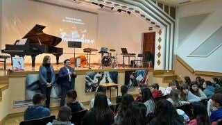 Teo García, junto a la directora del Conservatorio, Adela Torres, ha dado la bienvenida al alumnado de los colegios Gómez Manrique, Garcilaso de la Vega y Ciudad de Aquisgrán que han participado en el primero de los cuatro pases de este espectáculo que se ofrecerán entre hoy y mañana y ha dado las gracias al profesorado del ‘Jacinto Guerrero’ por “prestarnos lo mejor de ellos, su música y su arte, y acercárnoslo de una forma didáctica y pedagógica”.