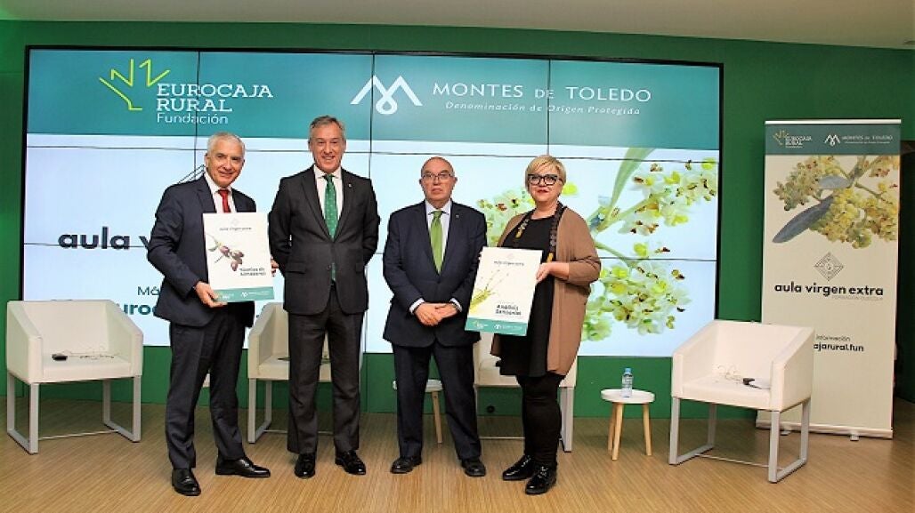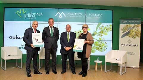 En el acto han participado el presidente de la Fundación Eurocaja Rural, Javier López Martín, el presidente de la D.O.P. Montes de Toledo, Gregorio Gómez, y el gerente de la misma, Enrique García-Tenorio, así como la gerente de la Fundación Eurocaja Rural, Susana Cortés Martínez.