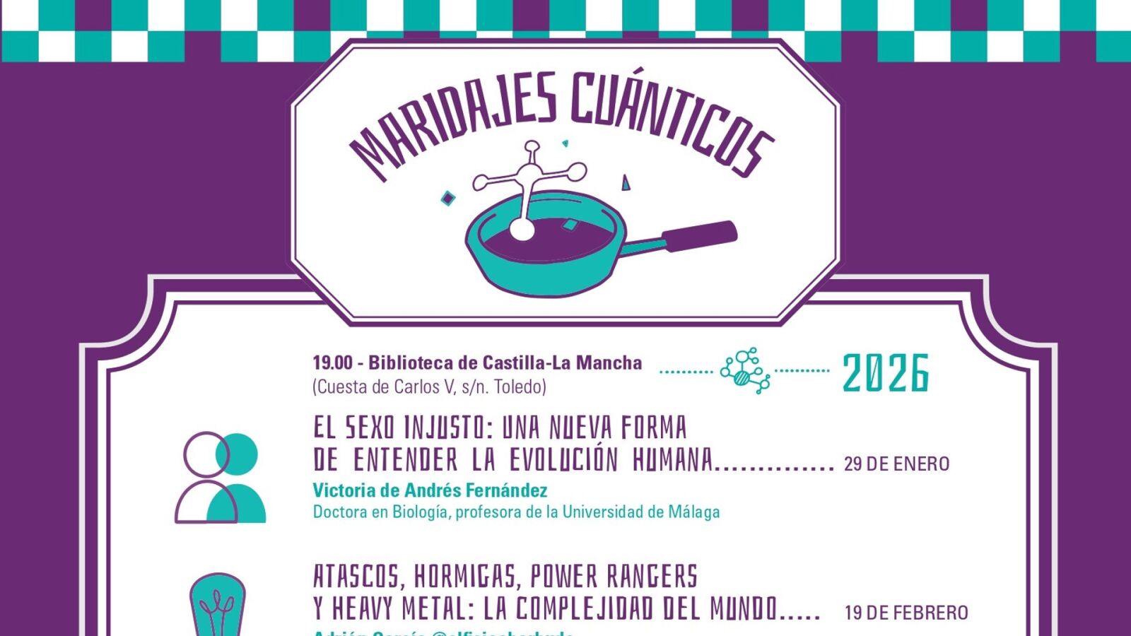 El ciclo Maridajes Cuánticos, con el apoyo de la Fundación Soliss y del Grupo Restoredo (Hotel Carlos V), se consolida como referente en comunicación social de la ciencia en Castilla-La Mancha, favoreciendo el acceso universal a la cultura científica mediante la participación de los divulgadores y las divulgadoras con mayor éxito y demanda en medios de comunicación, eventos y redes sociales. La entrada es libre y gratuita hasta completar aforo.