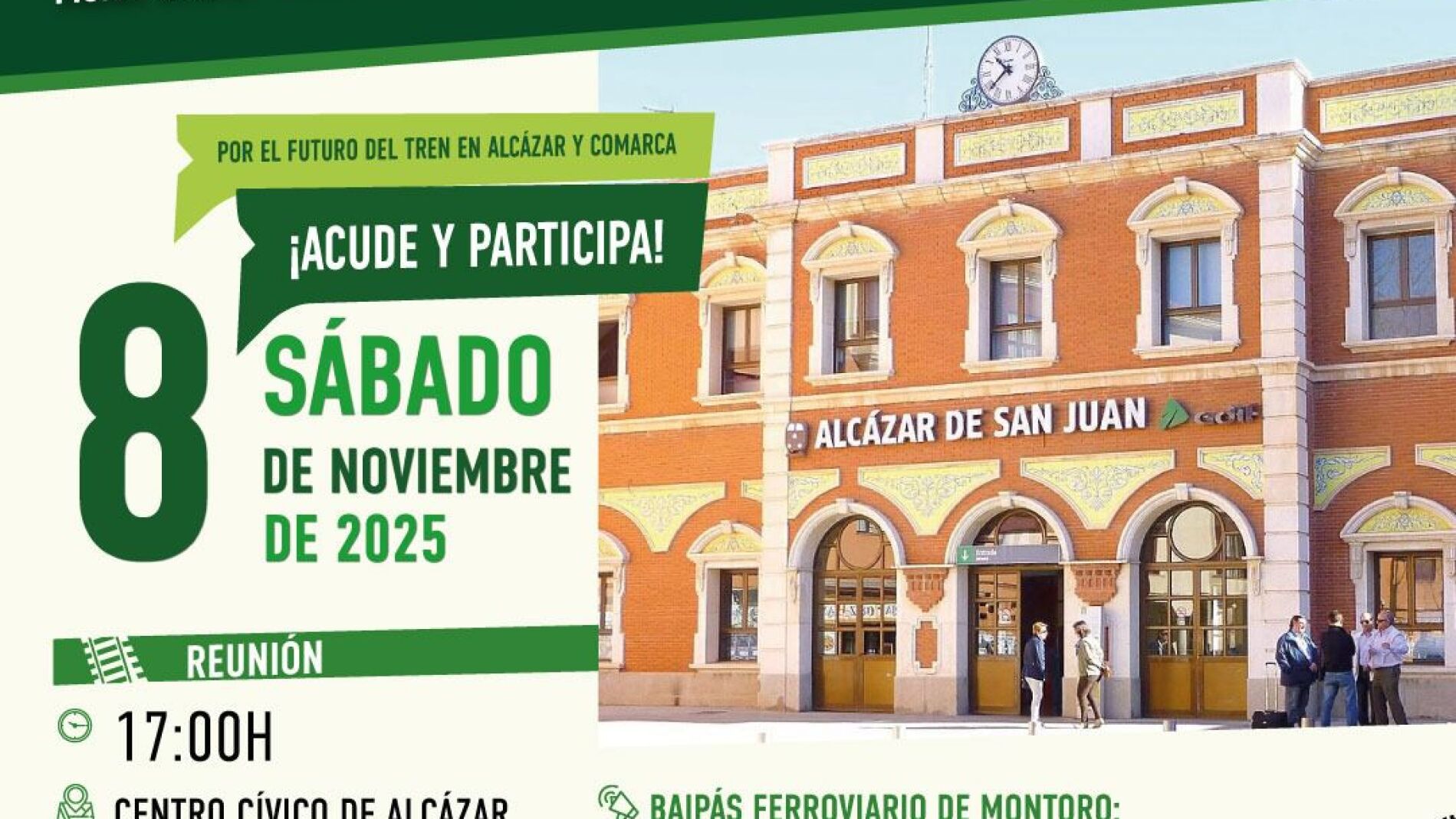 El evento tendrá lugar a las 17:00 en el centro cívico de Alcázar de San Juan (Plaza de España, S/N) y servirá para plantear nuevas acciones e impulsar la construcción del tramo ferroviario “Mora-Orgaz - Madridejos-Consuegra – Alcázar de San Juan” de la nueva línea Madrid – Alcázar – Jaén.