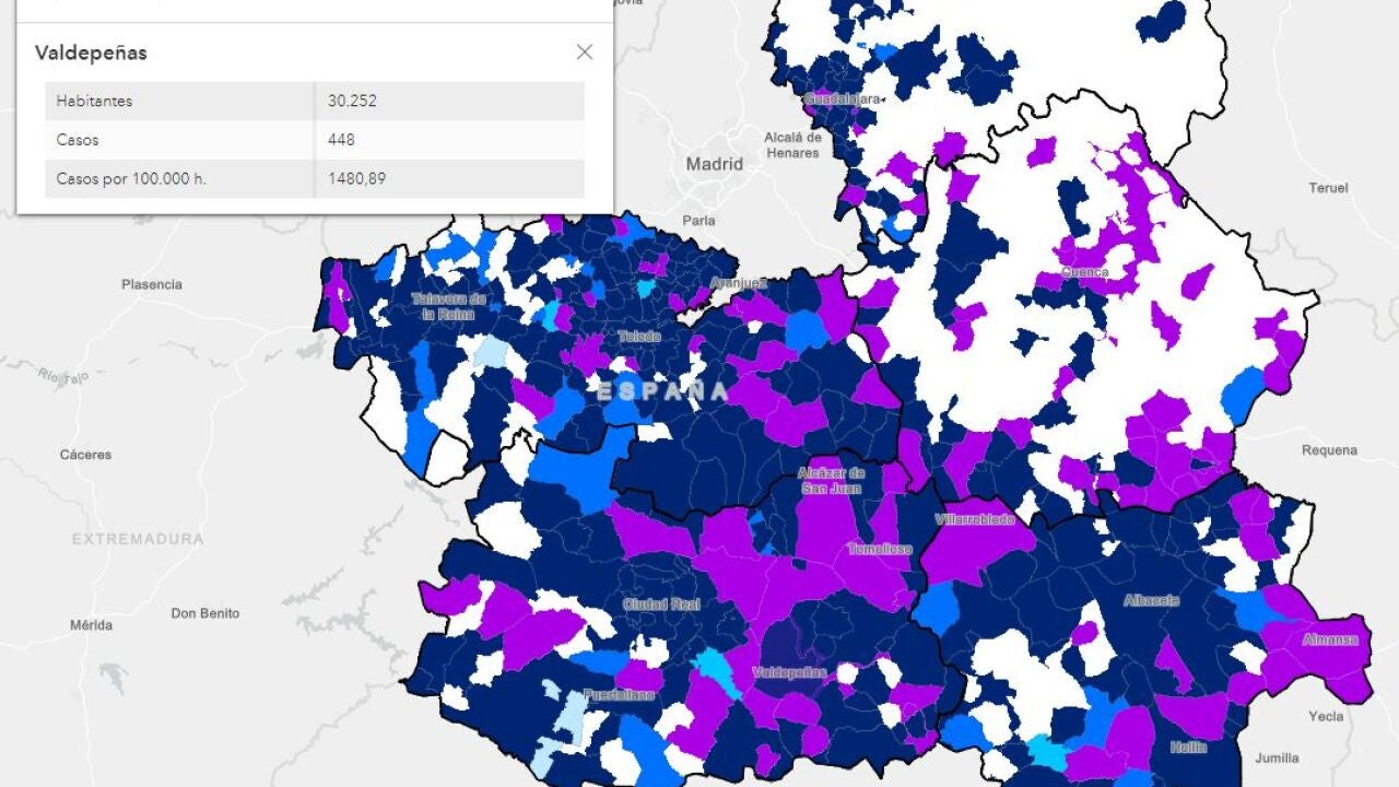 89 municipios están en nivel de riesgo muy alto o extremo al presentar una incidencia superior a 500 casos por 100 000 habitantes. Sobresale Corral de Calatrava con una incidencia de casi 5 200, mientras que con más de 3 000 están Alcoba de los Montes, Arenas de San Juan, Porzuna, Los Pozuelos de Calatrava, Puerto Lápice y Villarta de San Juan.