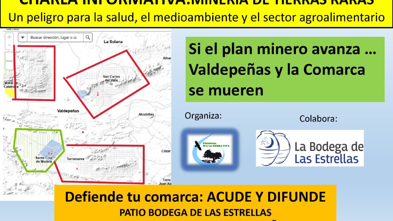 Sí a la Tierra Viva organiza esta cita bajo el lema "Si el plan minero avanza… Valdepeñas y la comarca se mueren". Una charla que se enmarca en el calendario de la plataforma para llevar al mayor número de localidades de la comarca de Campo de Montiel la información que tienen sobre la minería de tierras raras y el proyecto de exploración Neodimio de Quantum Minería.
