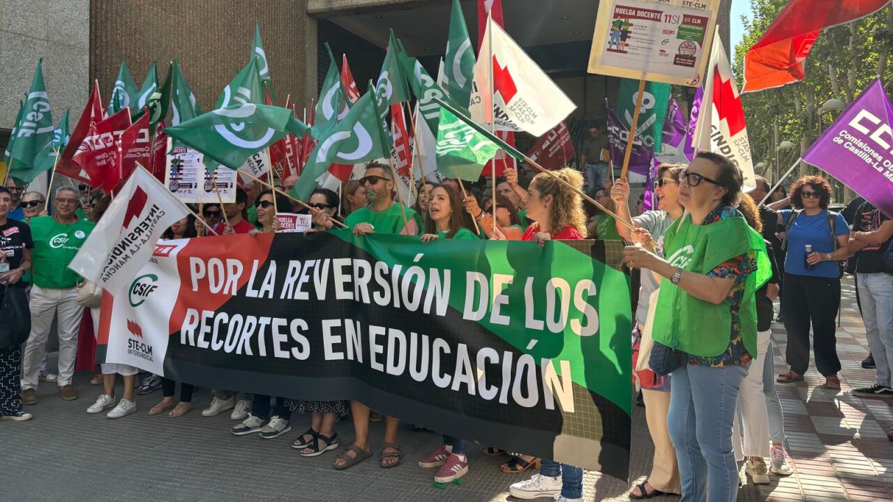 Frente a las puertas de la Delegación de Educación de la capital de la provincia los sindicatos convocantes, que representan alrededor del 60% del profesorado, se han concentrado para recordar las principales reivindicaciones que han motivado esta protesta, coincidiendo con el inicio del curso escolar.