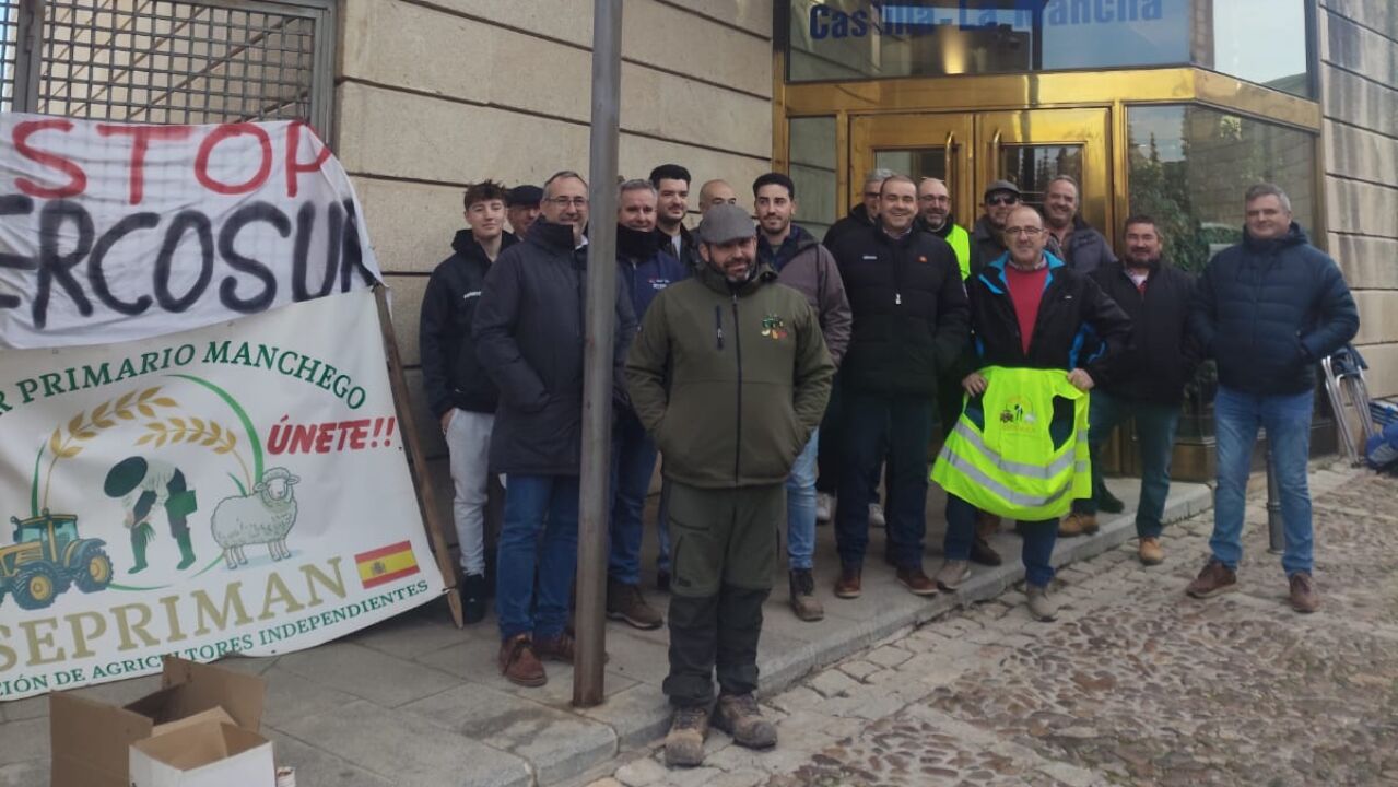 Primera jornada de protestas de la asociación Sector Primario Manchego en la sede de la Consejería de Agricultura en Toledo. SEPRIMAN demanda que no se firme el acuerdo comercial entre la Unión Europea y Mercosur, afirma que perjudica gravemente a los agricultores y ganaderos españoles porque no pueden competir en igualdad de condiciones con los países que integran este grupo: Brasil, Argentina, Paraguay y Uruguay.