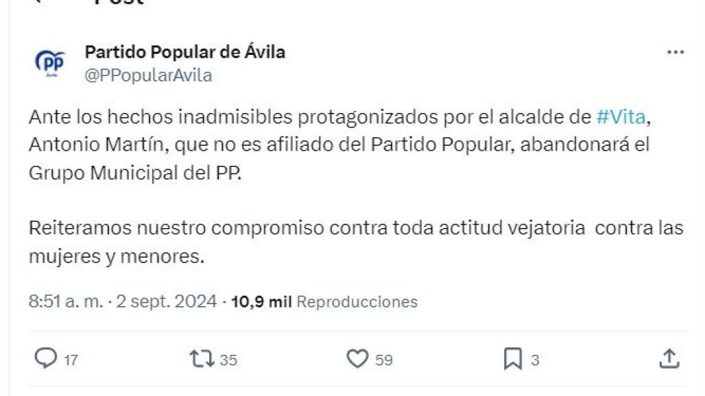 En un comunicado difundido a través de la red social "X", el PP abulense señala que Martín, que no es afiliado de esta formación, abandonará el grupo municipal de los populares tras protagonizar unos "hechos inadmisibles", al tiempo que expresa su "compromiso contra toda actitud vejatoria contra las mujeres y menores".