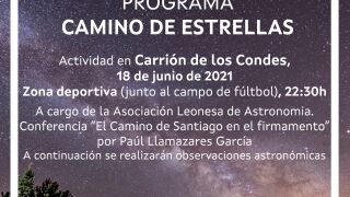 La actividad en Carrión de los Condes prevista para el viernes 18 de junio se celebrará a partir de las 22:30 horas en la zona deportiva junto al campo de futbol. La actividad correrá a cargo de la Asociación Leonesa de Astronomía y consistirá en una conferencia ‘El Camino de Santiago en el firmamento’ a cargo de Paúl Llamazares García, seguida de una observación astronómica.