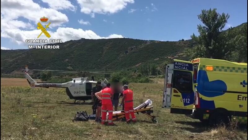 A las 13´10 horas, tras ser localizado el accidentado, Unidad Aérea realiza apoyo parcial en las proximidades, descendiendo personal del GREIM que proceden a la inmovilización del herido, quién sufría lesiones en la tibia derecha. Una vez inmovilizado, la aeronave se aproxima a escasos centímetros para el embarque del accidentado y una acompañante que se encontraba igualmente en el lugar del accidente, siendo evacuados ambos a la localidad de Cardaño (P), donde esperaba ambulancia junto a Patrulla de Seguridad Ciudadana.