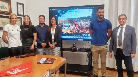 El diputado delegado del servicio de Deportes Eduardo Tejido y el coordinador de Deportes, Enrique Hermoso acompañados de la concejala de deportes de Aguilar, Soraya Isasi y de los responsables de la entidad organizadora, el director de la Hixpania Hard Enduro 24MX, Enrique Caballero, y la encargada de la difusión, Leticia Caballero, así como la subcampeona del mundo de trial, y piloto en el Hard Enduro Dakar, Sandra Gómez, han sido los encargados de dar a conocer la prueba 24MX Hixpania Hard Enduro 2023, que por séptimo año regresa a Aguilar de Campoo entre los días 12 y 15 de octubre, después de haber batido la temporada pasada todos los récords, tanto de participación, con más de 300 pilotos, como de visitantes, con más de 10.000 personas entre el público.