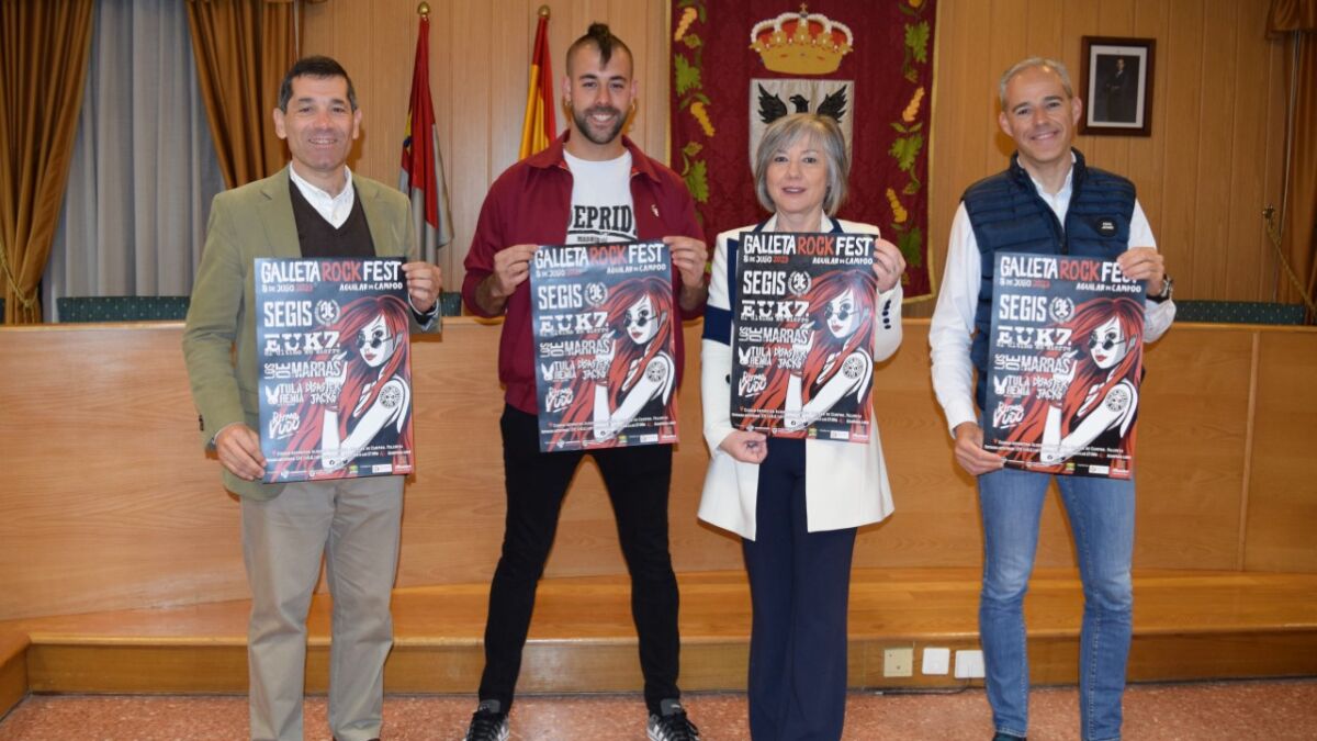 La alcaldesa de Aguilar de Campoo, María José Ortega; el concejal de Festejos, Diego Pérez; Francisco Hevia, director corporativo de Galletas Gullón, y David Calderón, miembro de la Asociación Cultural Galleta Rock, han presentado durante la mañana de este jueves el cartel final del Galleta Rock Fest, que se celebrará el día 8 de julio el la Ciudad Deportiva Alberto Fernández de Aguilar de Campoo. La música será la gran protagonista de esta cita, que arrancará a las 17.00 horas con la apertura de puertas del recinto, en el cual habrá además una cita para la acampada libre de todos los asistentes.