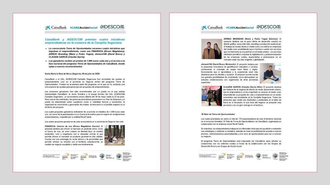 AIDESCOM y CaixaBank premian cuatro iniciativas emprendedoras de la campiña segoviana en la convocatoria Tierra de Oportunidades