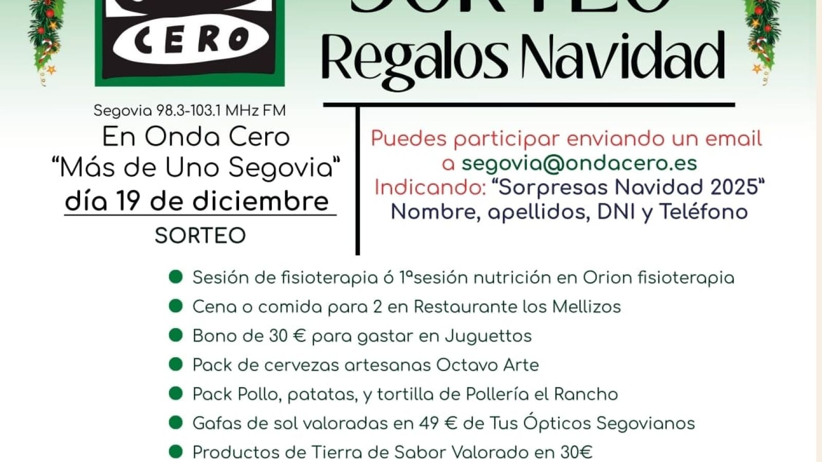 El 19 de diciembre haremos el sorteo en directo con todas aquellas personas que nos manden un correo electrónico, a segovia@ondacero.es, indicando que quieren participar y dejando su nombre, apellidos, DNI y teléfono.