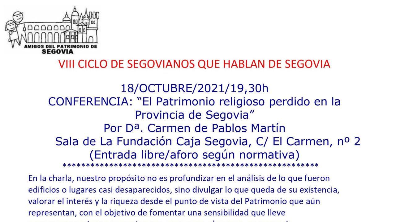 La Asociación Amigos del Patrimonio de Segovia retoma la celebración del ciclo ‘Segovianos que hablan de Segovia’, con cambio de sede a la Sala de Caja Segovia en esta primera conferencia.
