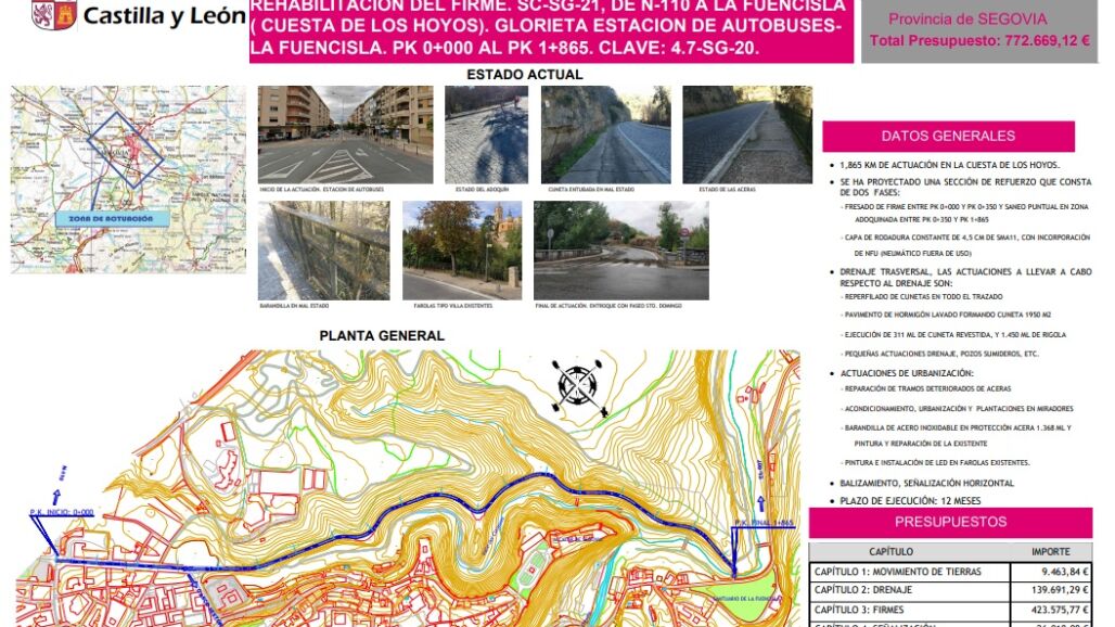 También a lo largo de este 2025, se espera que comience la segunda de las actuaciones en las travesías segovianas; se trata de la mejora de la Cuesta de los Hoyos, donde se van a invertir 770.000 euros y que va a suponer la extensión de una capa de asfalto sobre los adoquines actuales.