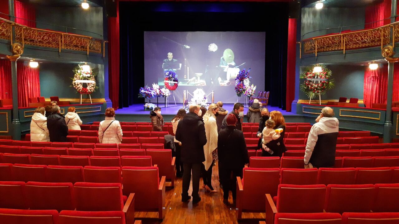 El féretro con los restos mortales de Juan Antonio Quintana se ha instalado en el escenario, rodeado de un cordón de terciopelo sostenido por seis postes y con un gran ramo de flores de la Diputación de Valladolid a sus pies. Junto al resto de ramos y coronas fúnebres dispuestos sobre la tarima del Zorrilla, una gran pantalla al fondo proyectaba la imagen del intérprete en ese mismo teatro.