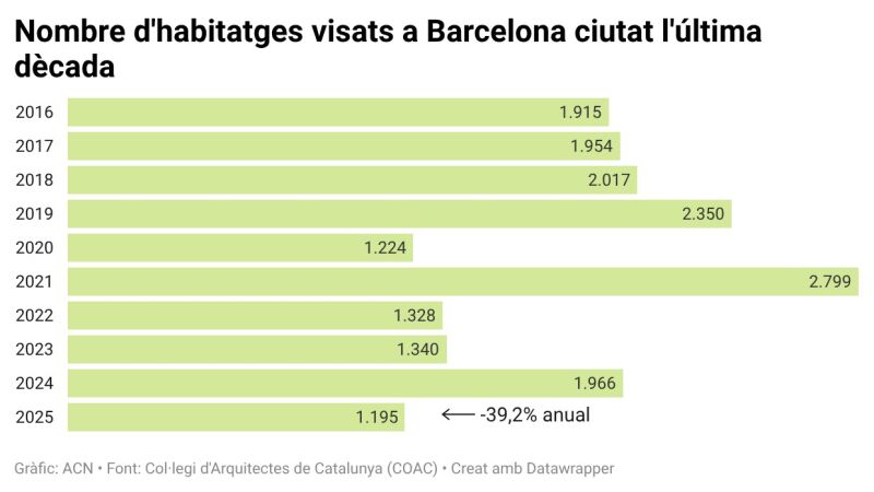 La capital catalana havia estat històricament el punt fort de la construcció, però al llarg de la darrera dècada la situació s’ha revertit i ara repercuteix en la caiguda general de Catalunya. En nombre d’habitatges, la demarcació de Barcelona és l’única amb dades negatives, i Barcelona ciutat, amb 1.195 nous habitatges visats, viu una davallada del 40% respecte al 2024 i presenta la xifra més baixa dels últims 10 anys. Principalment, perquè no hi ha lloc on construir. La solució passa, a Barcelona, per rehabilitar edificis envellits. Tot i això, 6 de cada 10 habitatges visats el 2025 es troben a la demarcació de Barcelona, una dada que accentua la crisi d’habitatge que travessa Catalunya. Les dades, doncs, queden lluny dels objectius polítics. Sònia Oliveras, directora general del COAC, apunta que "ja hi ha voluntat política però encara no s'està notant en els habitatges visats pel sector privat".