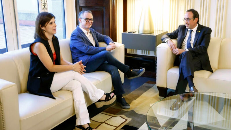 El presidente del grupo de ERC en el Parlament, Josep Maria Jové, y la portavoz del partido, Marta Vilalta, se han reunido sobre las 10.00 horas con Rull en el marco de la ronda de consultas que lleva a cabo antes de la convocatoria del pleno de investidura.