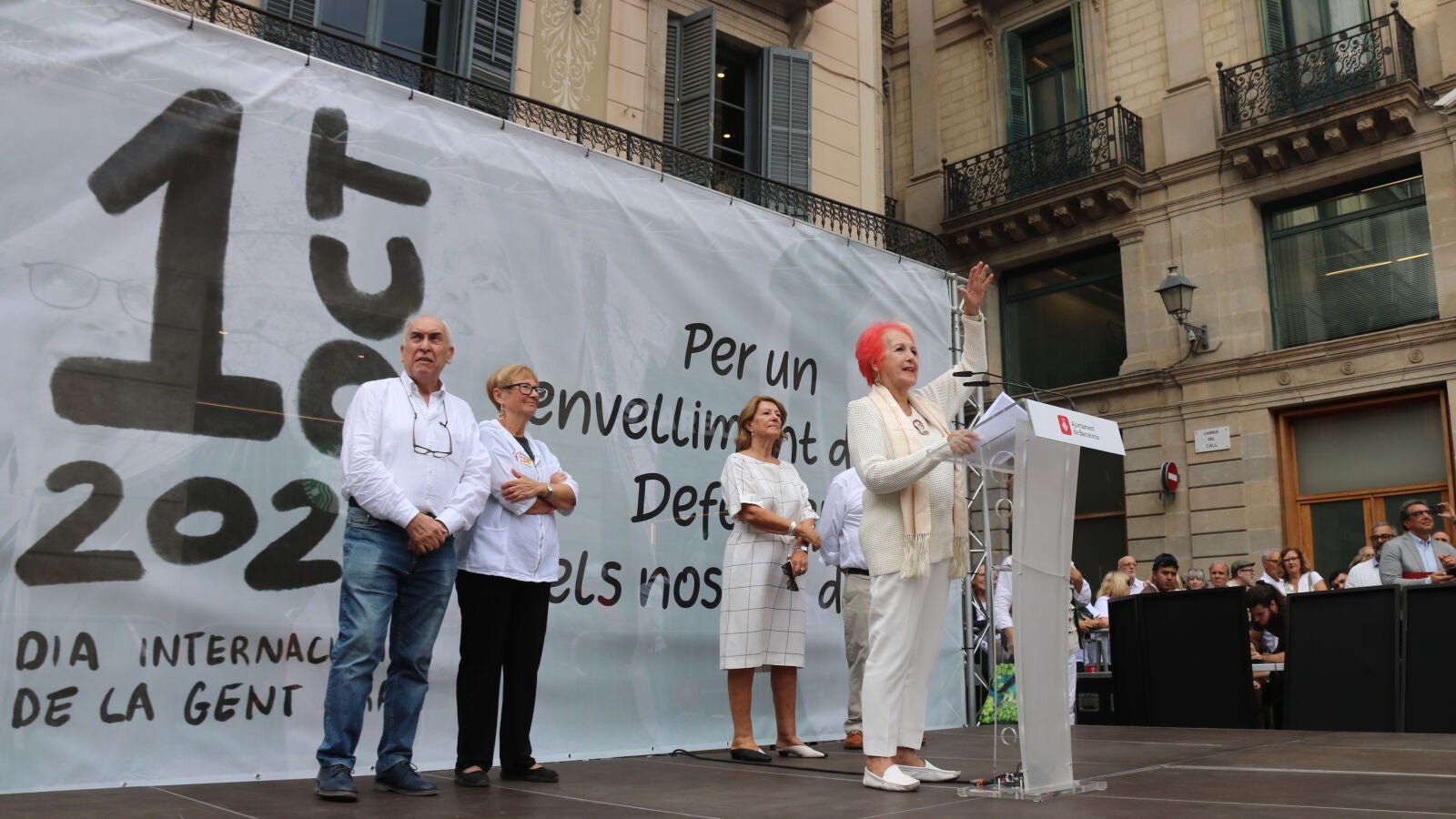 Entre el públic de l’acte unitari hi havia no només càrrecs institucionals, sinó també rostres coneguts, com Joan Manuel Serrat. També la periodista Rosa Maria Calaf, que ha estat l’encarregada de llegir el manifest. Ella es reivindica orgullosament com una dona vella, diu, i considera que, després de moltes lluites socials al llarg de la seva vida, ara li toca combatre l’edatisme. "Hi ha hagut molts -ismes a la meva vida: el racisme, el colonialisme, el feminisme... I, en aquests moments, hi ha l'edatisme", ha resumit.