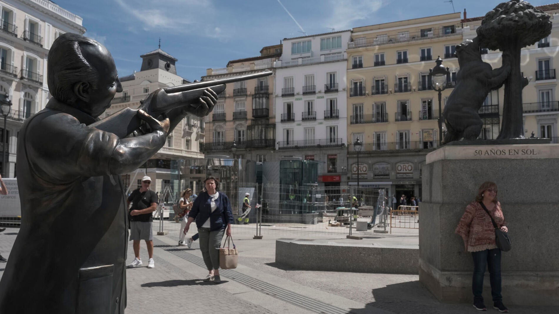 Una escultura del rey Juan Carlos I ha aparecido junto a la famoso monumento de 'El Oso y El Madroño' de la Puerta del Sol de Madrid. La estatua del rey emérito porta un rifle de cara apuntando hasta el monumento.