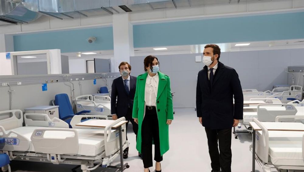 La presidenta de la Comunidad de Madrid, junto a Pablo Casado, Ignacio Aguado, Martínez-Almeida y Enrique Ruiz Escudero, ha inaugurado este martes el hospital Enfermera Isabel Zendal, construido en un breve espacio de tiempo y diseñado para combatir la pandemia.