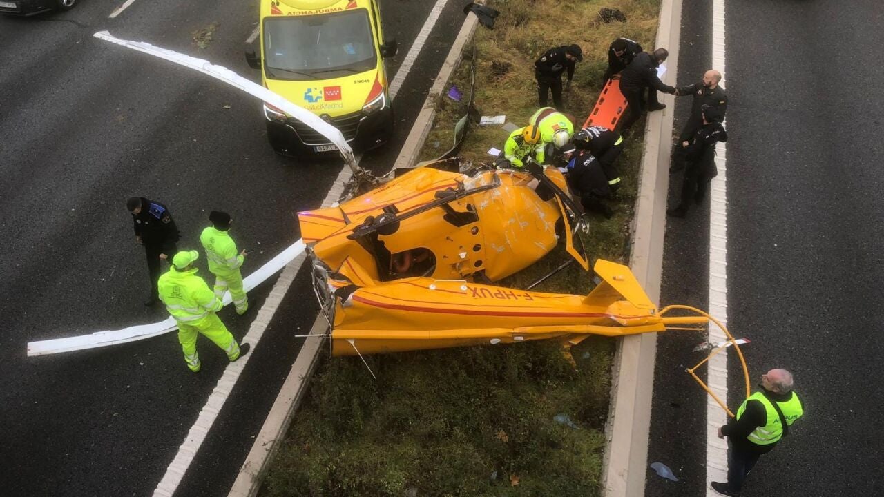 El accidente del helicóptero, de color amarillo con matrícula F-HPUX, ha tenido lugar en la mediana de la M-40 a la altura del Campo de las Naciones, próximo a IFEMA, donde estos días se ha celebrado la feria de aviación European Rotors.