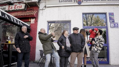 Una veintena de vecinos de Móstoles han hecho frente a las bajas temperaturas de este día de la Epifanía del Señor para salir a la calle y celebrar, entre besos, abrazos y alguna que otra lágrima, el número que la localidad recordará siempre, el 89.634.