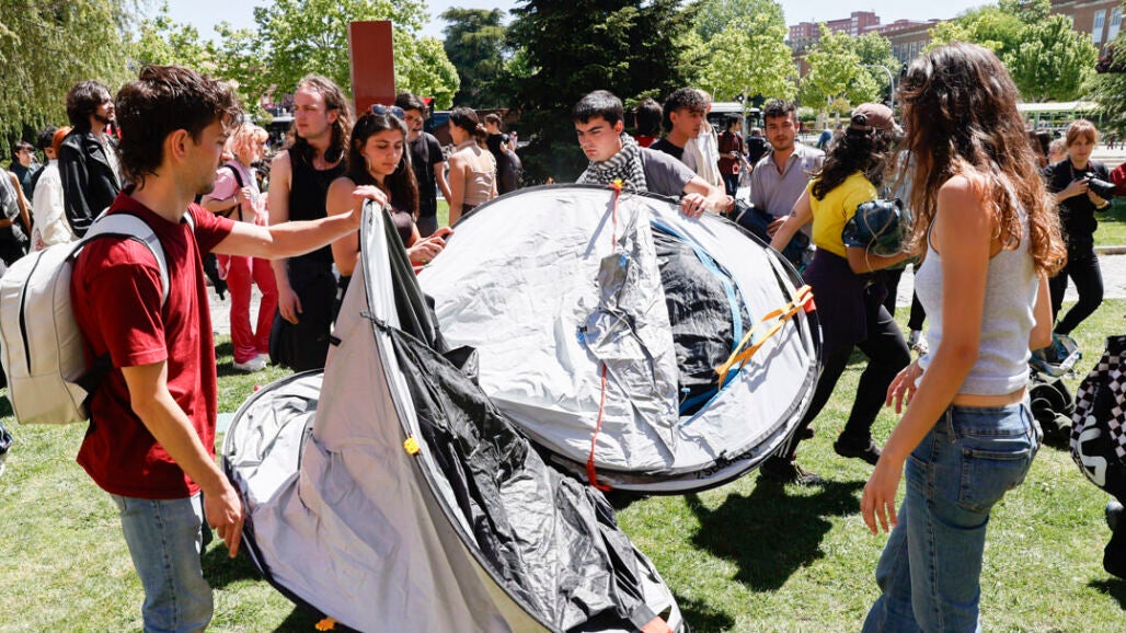 Universitarios madrileños se concentraron ayer martes en las inmediaciones del campus de la Universidad Complutense de Madrid (UCM) en el inicio de esta acampada indefinida al grito de "desde el río hasta el mar, Palestina vencerá".
