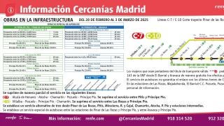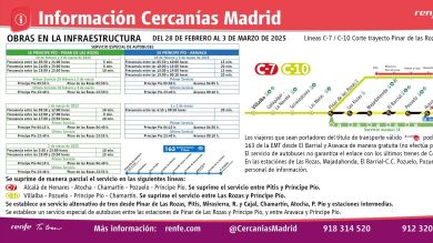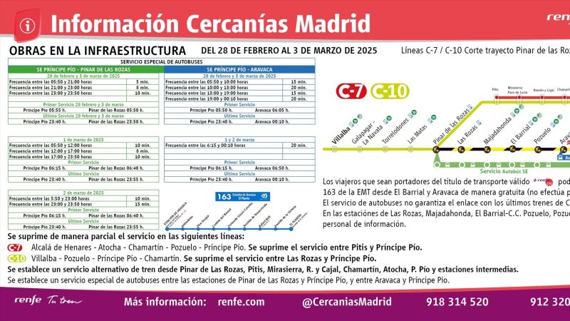 Renfe ha establecido un plan de movilidad ante el cierre del servicio de Cercanías entre las estaciones de Príncipe Pío y Pinar de las Rozas desde este viernes y hasta el 3 de marzo, ambos inclusive, que incluye dos servicios de autobuses y la modificación del recorrido de la línea C-10. Con motivo de este corte por obras de mejora en la infraestructura, no prestarán servicio las estaciones de Las Rozas, Majadahonda, El Barrial, Pozuelo y Aravaca
