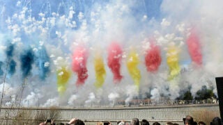 Por primera vez desde 1980 y con 3.000 detonaciones, la 'mascletà' ha teñido el cielo de Madrid de humo y pólvora, incluso con los colores de la bandera de España, de la Comunidad de Madrid y de Comunidad Valenciana. A las 13.00 horas se ha prendido la mecha y la traca final ha impresionado a los miles de asistentes al evento.