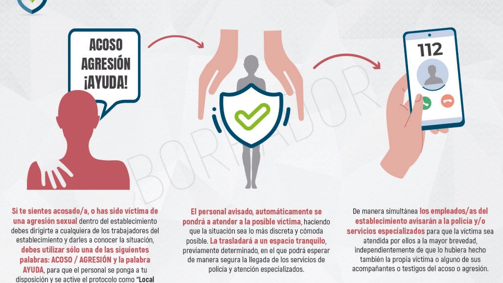En primer lugar, el objetivo es que los locales se adhieran a este protocolo como “Local activo ante posibles situaciones de acoso o agresión sexual entre clientes”. Para ello tendrán que disponer de información y señalética visible para los clientes en la que se muestre claramente las instrucciones a seguir ante una posible situación de acoso o agresión sexual.