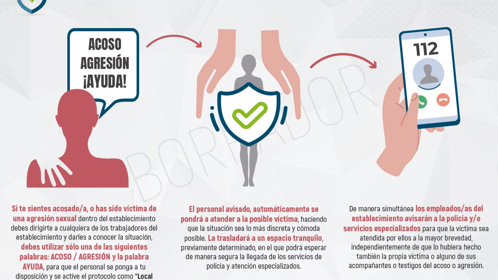 La información visible para los clientes debe explicar el modo de proceder y los pasos a seguir si se encuentran en una situación de acoso, o han sido víctima de una agresión sexual por otro cliente dentro del establecimiento. Deberá dirigirse a cualquiera de los trabajadores del establecimiento y darles a conocer la situación, utilizando una de las siguientes palabras: acoso/agresión y la palabra ayuda, para que el personal se ponga a su disposición y se active el Protocolo.