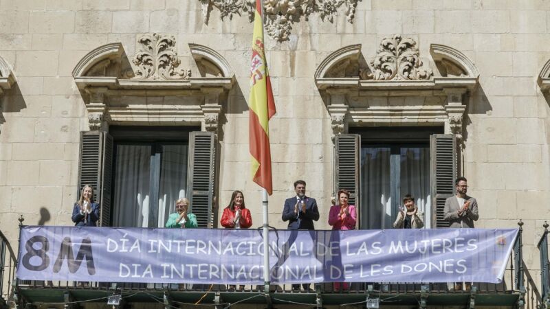 Alicante se ha sumado este miércoles 8 de marzo al homenaje a las mujeres y a la reivindicación de la igualdad real con motivo de la conmemoración del Día Internacional de la Mujer. El acto institucional se ha celebrado en el Salón Azul del Ayuntamiento presidido por el alcalde, Luis Barcala, y la concejala de Igualdad, María Conejero, y al término del mismo se ha desplegado la pancarta conmemorativa desde el balcón de la Casa Consistorial.