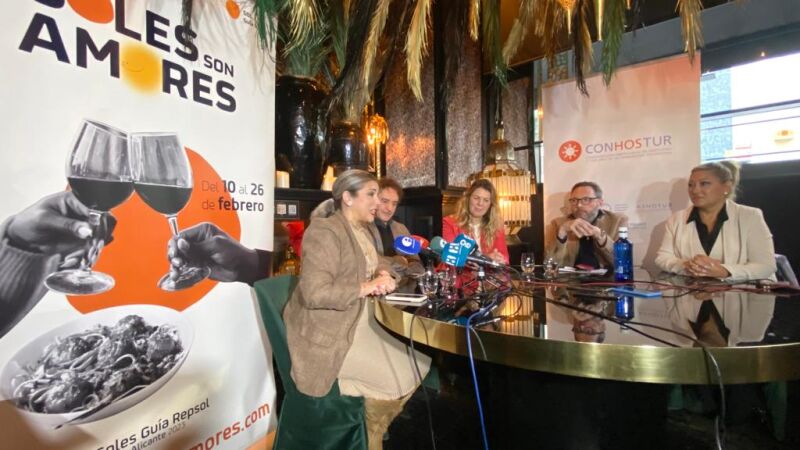 La Confederación Empresarial de Turismo y Hostelería de la Comunidad Valenciana (CONHOSTUR) con la colaboración de Turisme Comunitat Valenciana y la Guía Repsol, ponen en marcha el próximo 10 de febrero y hasta el 26 de este mismo mes, las jornadas ‘Soles son amores’. En la presentación celebrada en el restaurante El Portal de Alicante han intervenido Francesc Colomer, secretario Autonómico de Turisme; María Ritter, directora de Guía Repsol; Mari Carmen Sánchez, vicealcaldesa de Alicante; Manuel Espinar, presidente de CONHOSTUR y María del Mar Valera, presidenta de APEHA.