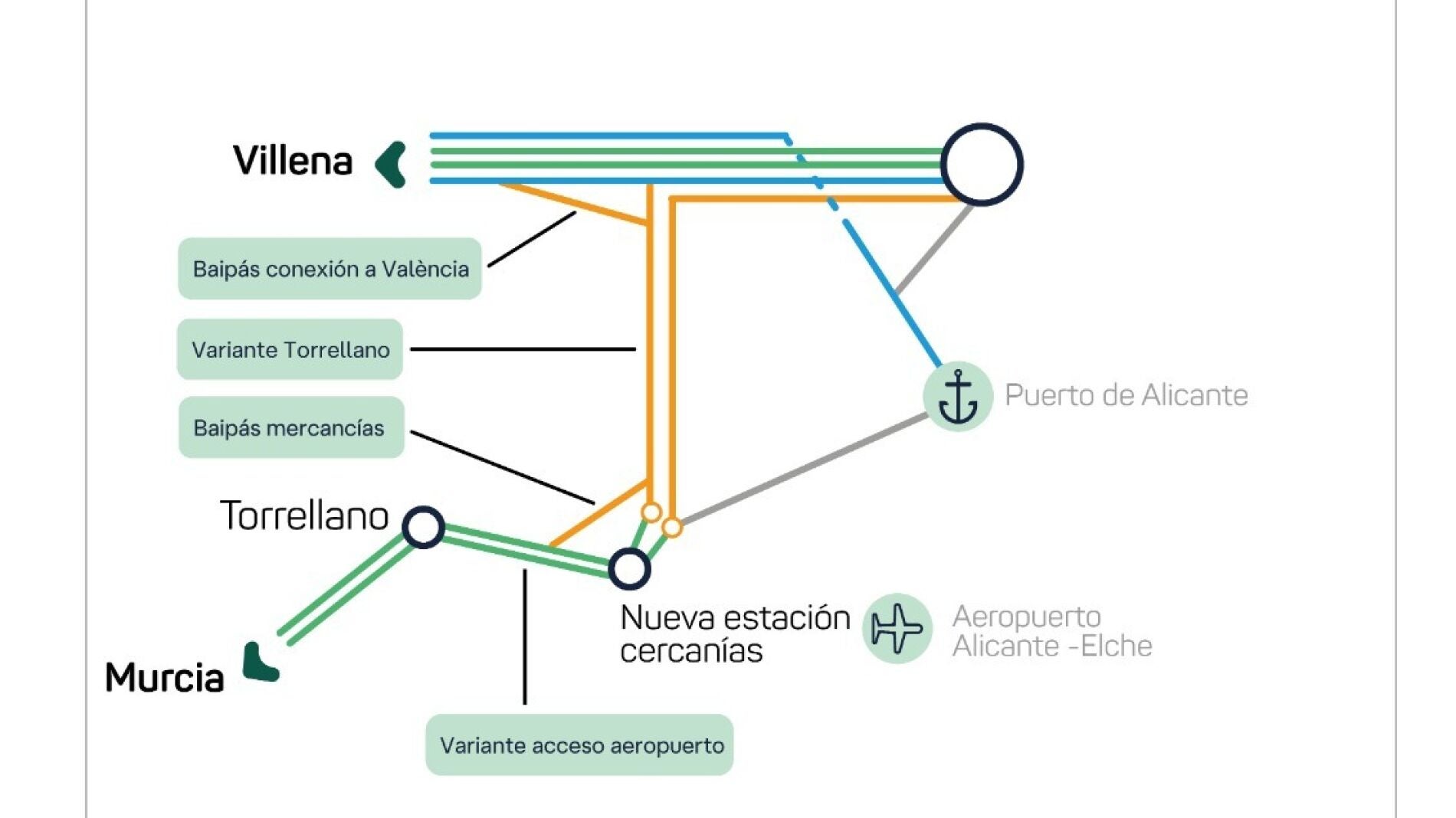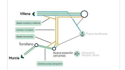 El tramo inicial discurre a lo largo de aproximadamente 2,5 km por la línea convencional que une la capital con Villena, mediante un tercer carril que se instalará sobre la infraestructura actual; a partir de ese punto, la vía se duplica y se configura exclusivamente en ancho estándar. Asimismo, los proyectos incluirán los ramales de conexión con las líneas Alicante-La Encina (dirección Valencia) y Alicante-El Reguerón (dirección Murcia).