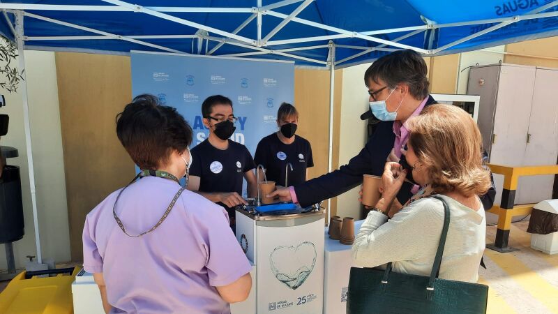 Coincidiendo con la llegada de las altas temperaturas, Aguas de Alicante, en colaboración con la Asociación APSA, pone a disposición de las personas que visitan diariamente el punto de vacunación masiva en la Ciudad de la Luz, varios quioscos en los que se dispensa agua del grifo refrigerada.