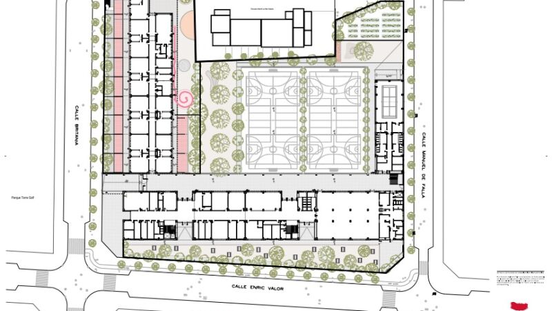 El edificio que da a la calle Britania, de una sola planta, acogerá las aulas, baños, despachos, almacenes y espacios comunes de educación infantil. El segundo edificio, con fachada a la calle Enric Valor, albergará las aulas de educación primaria, así como los despachos, zonas comunes y el comedor del centro. Este bloque tendrá dos plantas.