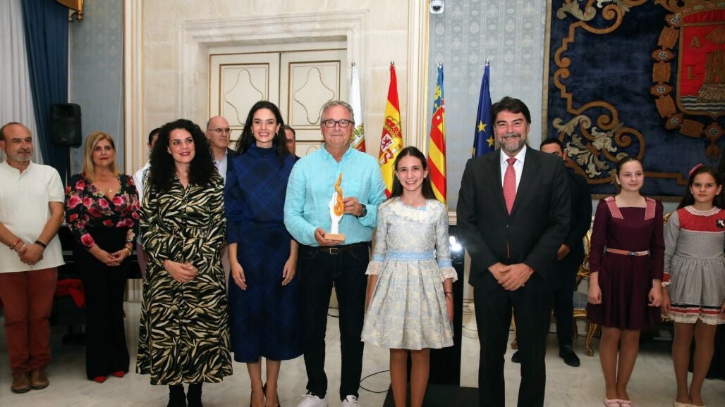 Sesenta piezas exclusivas de cerámica situadas sobre una peana de madera, originales del artista alicantino Vicente Giner, han sido entregadas en el transcurso de un acto que se ha desarrollado en el Salón Azul. El propio Barcala ha sido quien ha entregado las dos últimas distinciones a los artistas de las Hogueras Oficiales 2023: Pedro Espadero y Sergio Gómez. El primero, por ‘Geoda’. El segundo, creador de ‘D´Alacant al món’.