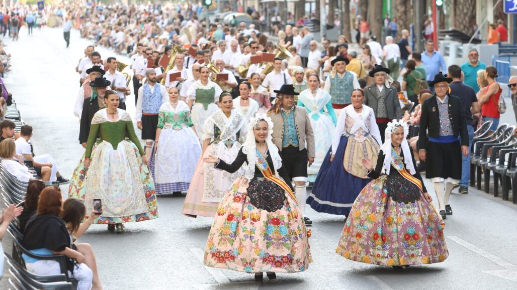 Las Belleas del Foc -Alba Muñoz y Martina Lloret-, y sus respectivas Damas de Honor -María Martínez, Alba Caturla, María Huesca, Mar León, Lucía González, Laura Ramírez, Sofía López, Isabella Guzzardo, Edurne Rosell, Laia Ponce, Daniela Vaquero, y Carla Lorente- han sido las primeras en desfilar junto con los integrantes de la Federació de Fogueres, que preside David Olivares.