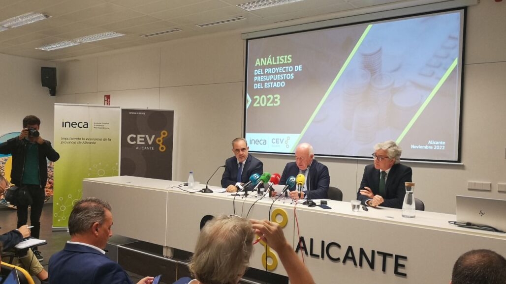 CEV Alicante y el Instituto de Estudios Económicos de la provincia de Alicante (INECA) han presentado hoy el informe de estudio Presupuestos Generales del Estado 2023 y su incidencia en la provincia de Alicante. Se trata del tercer año en el que las dos entidades colaboran en la presentación de este informe. La exposición ha corrido a cargo de Joaquín Pérez, presidente de CEV Alicante, Nacho Amirola, presidente de INECA, y Francisco Llopis, director de estudios de INECA. Al acto también ha asistido el presidente de la Cámara de Comercio de Alicante, Carlos Baño, siguiendo la línea de trabajo en conjunto iniciada por CEV, Cámara de Comercio e INECA en reivindicación de unos presupuestos dignos para la provincia de Alicante.
