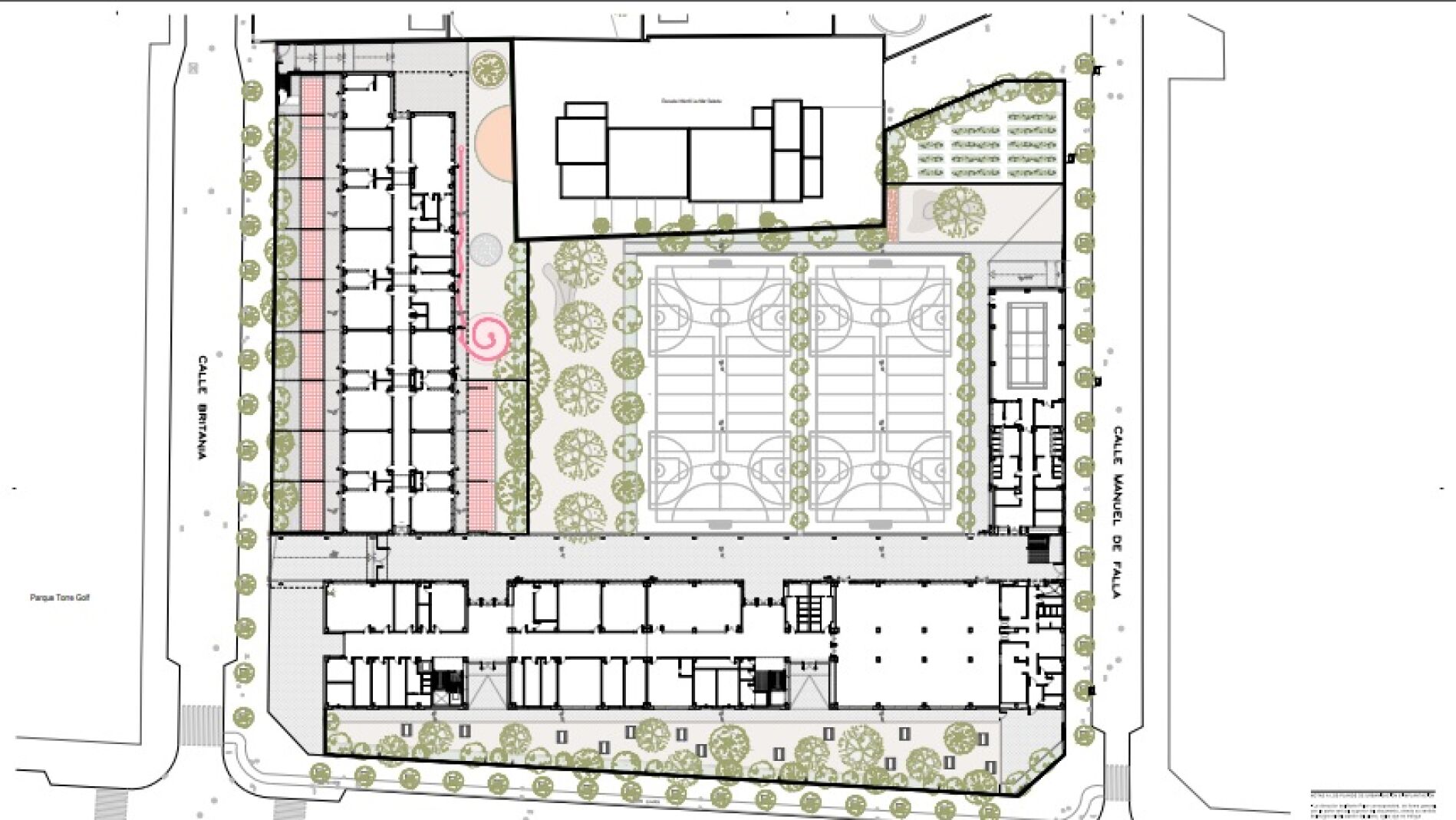 Por último, en el edificio más próximo a la calle Manuel Azaña se ubicará el gimnasio, con sus baños y vestuarios, sobre el que también está previsto ubicar aulas de Primaria. En el espacio central situado entre los tres edificios se habilitarán zonas de juego para las distintas etapas escolares y se situarán pistas deportivas exteriores.